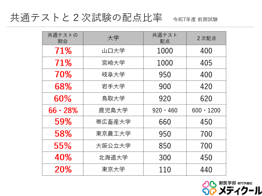 入試のポイントvol.2でも触れましたが、国公立大学獣医学部は何と言っても共通テストの配点比率が高い大学が多い点が特徴です。(以下参照)