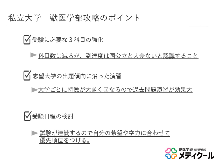 獣医学部専門予備校メディクールでは国公立大学、私立大学それぞれの試験日程や過去受験結果をまとめた『入試資料集』を無料進呈(PDF)していますので、是非ご活用ください。